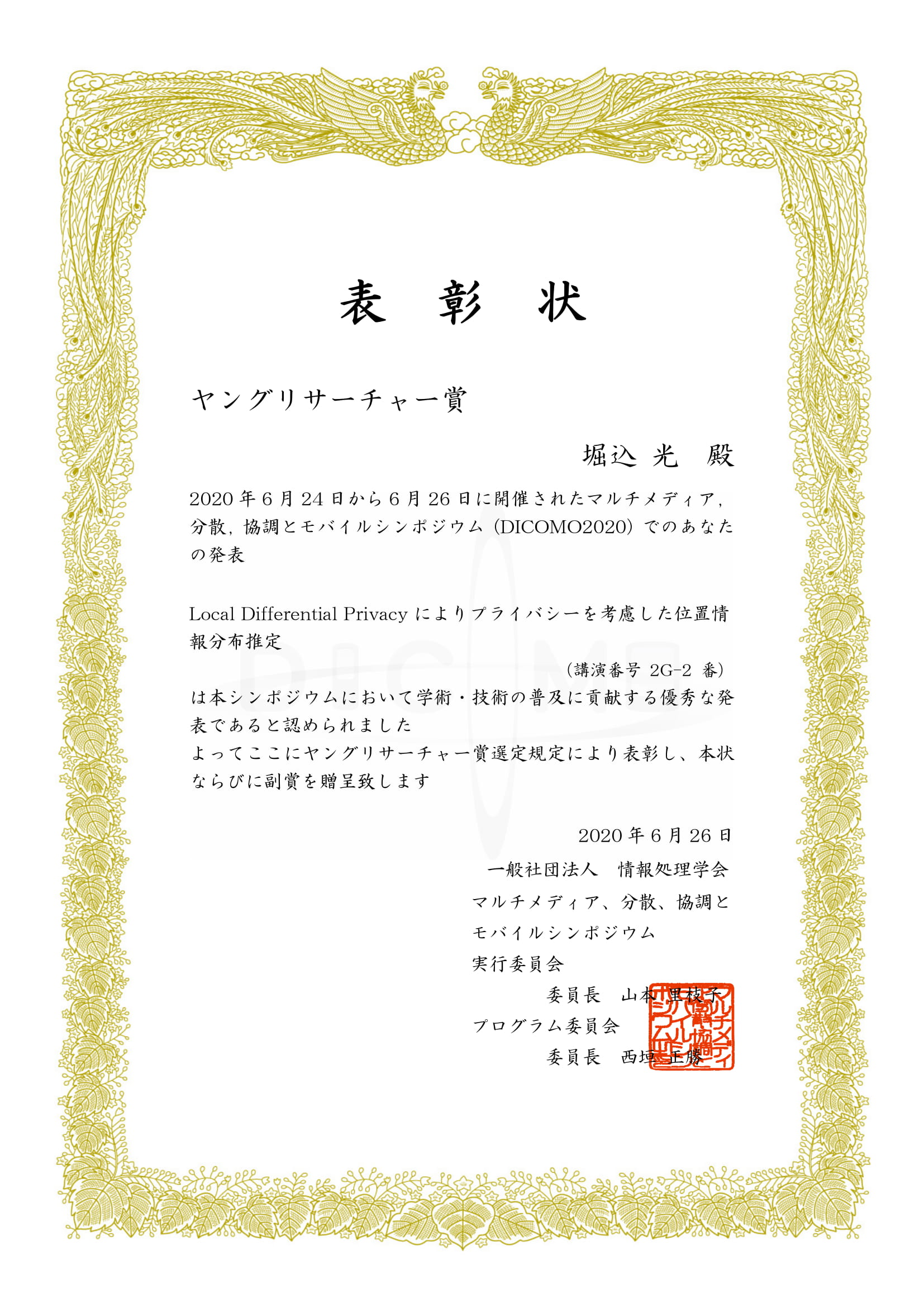 また,堀込が「Local Differential Priacyによりプライバシーを考慮した位置情報分布推定」というテーマで発表を行い,ヤングリサーチャー賞を受賞しました.