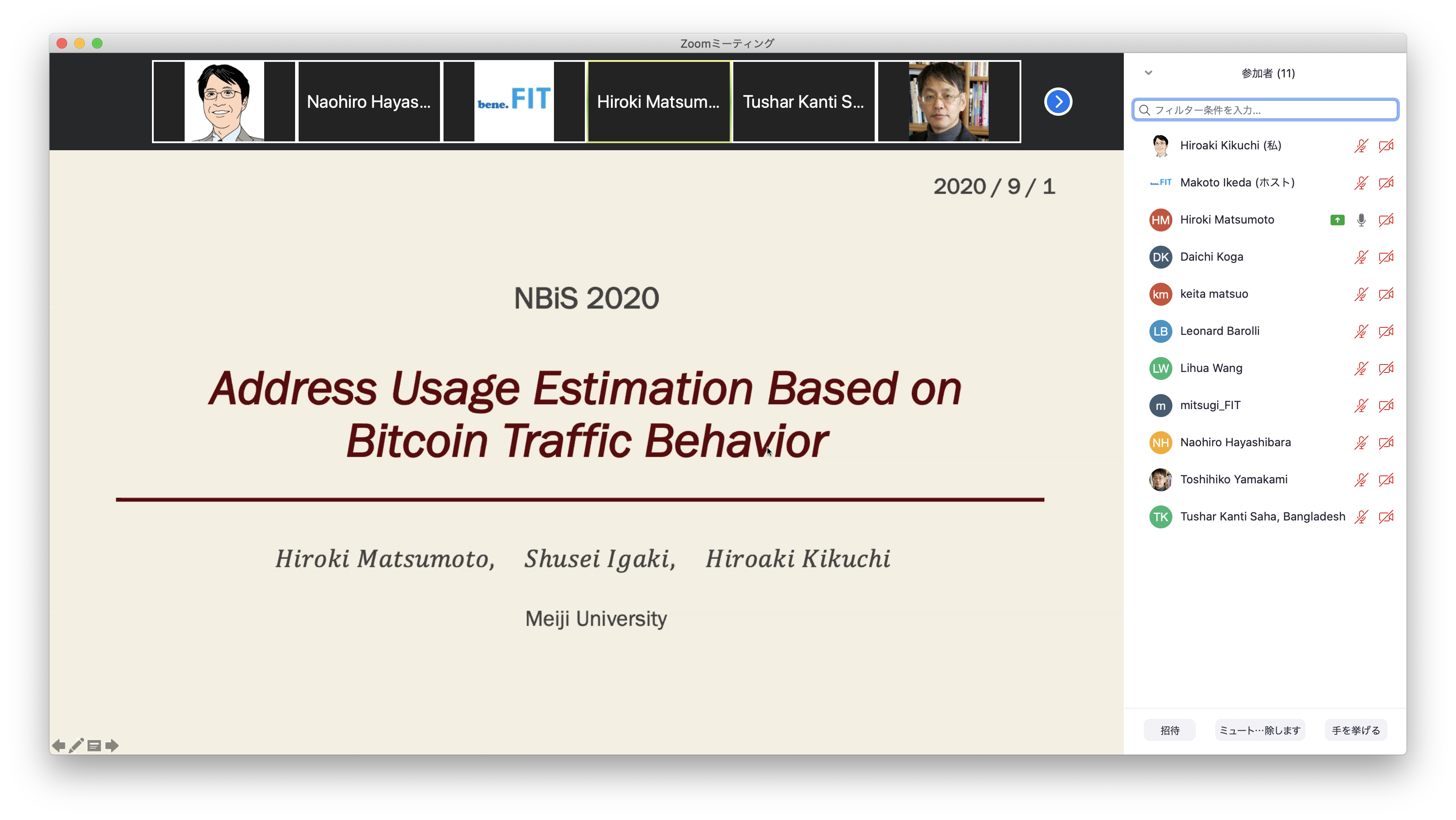 また,松本が「Bitcoinサービス業者と利用者アドレスの種類の推定と評価」というテーマで発表を行いました.
