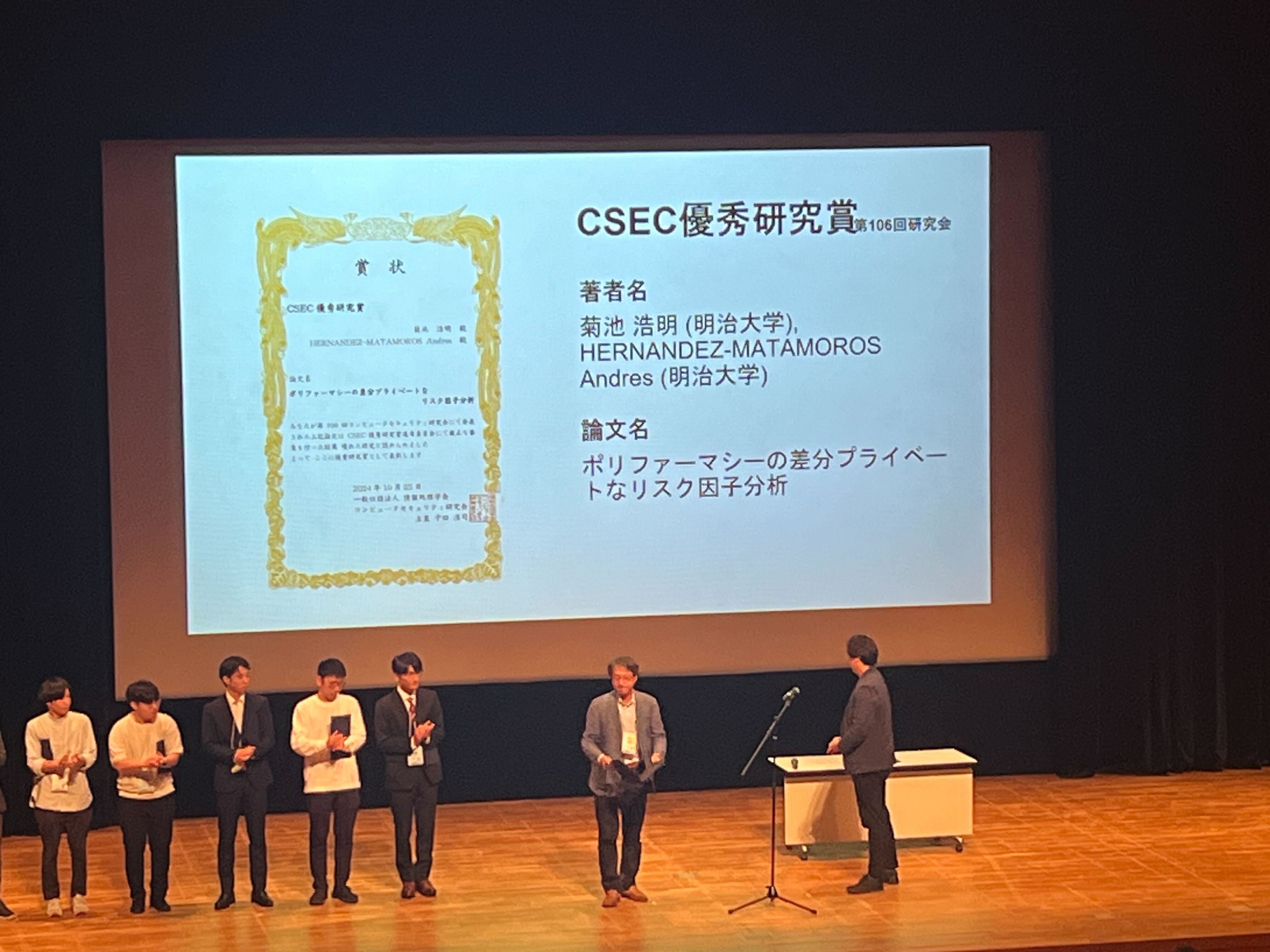また、菊池先生とAndressさんによる「ポリファーマシーの差分プライベートなリスク因子分析」の研究がCSEC優秀研究賞を受賞しました。