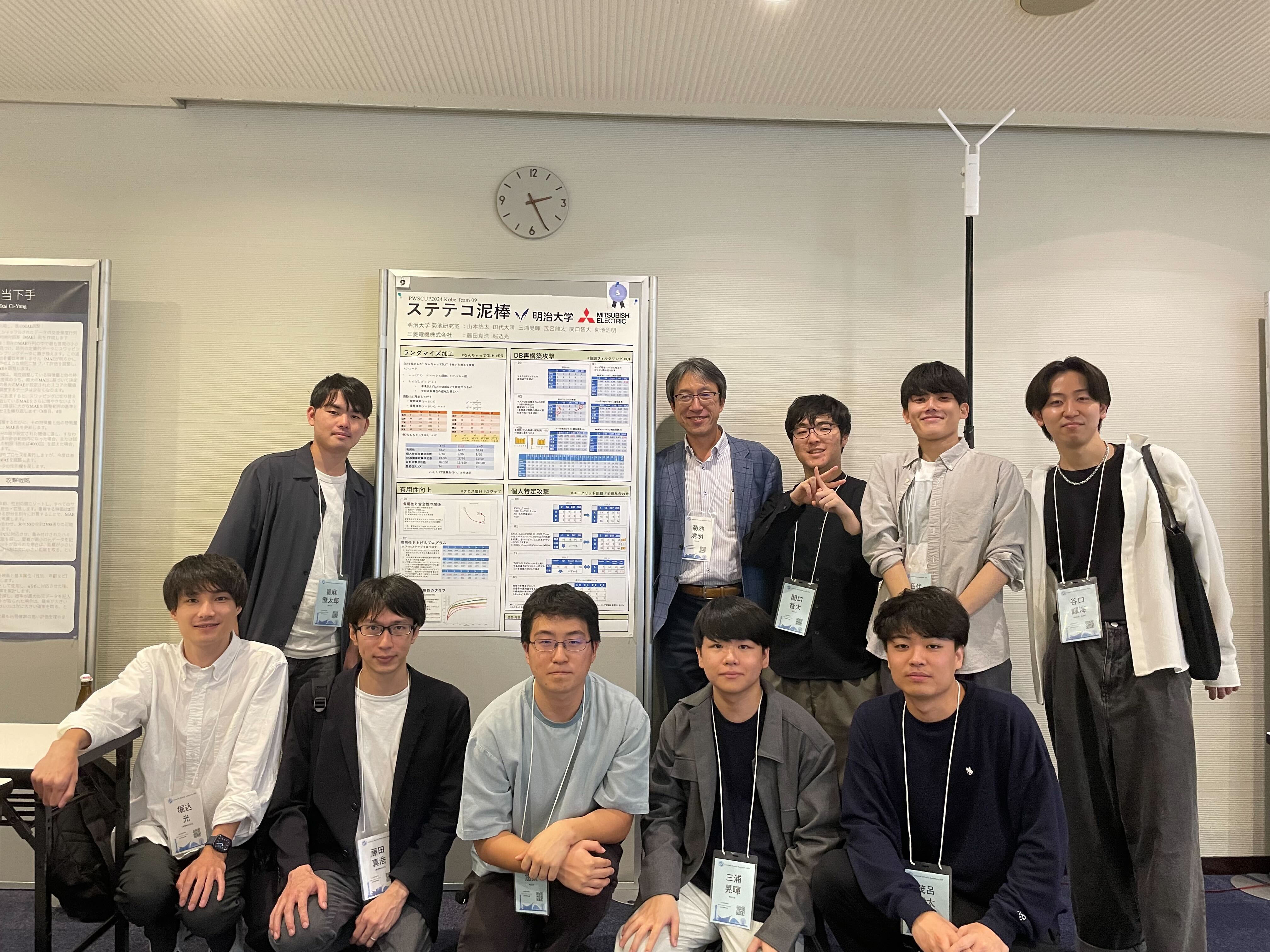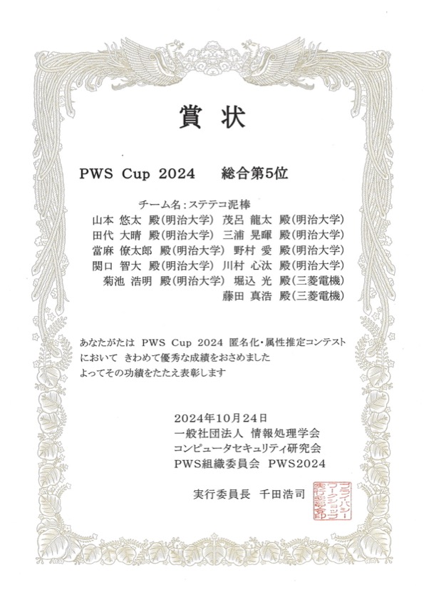 コンピュータセキュリティシンポジウム2024の3日目に第10回プライバシーワークショップ内でPWS CUP 2024が開催されました。 当研究室から菊池先生、M1の當麻、B4の山本、田代、三浦、茂呂、B3の関口、川村、野村が参加しました。 本コンテストには、三菱電機株式会社の藤田真浩さん、堀込光さんと合同でチーム「ステテコ泥棒」として参加し、第5位に輝きました。